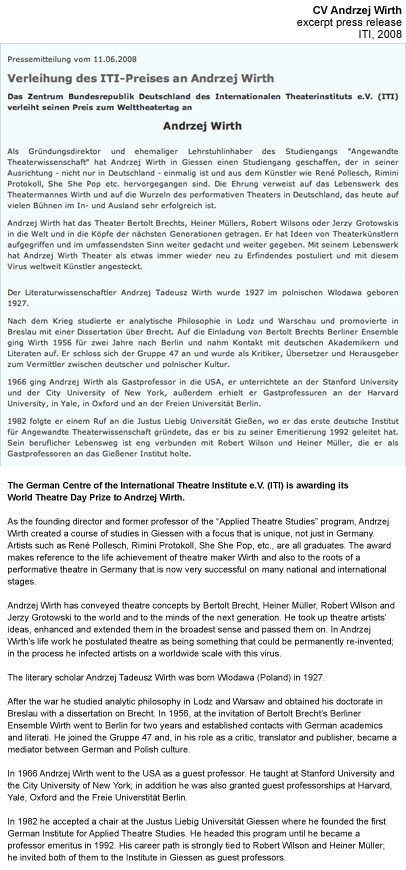 In 2008, Wirth received the German International Theater Institute’s „Welttheatertag Preis“.